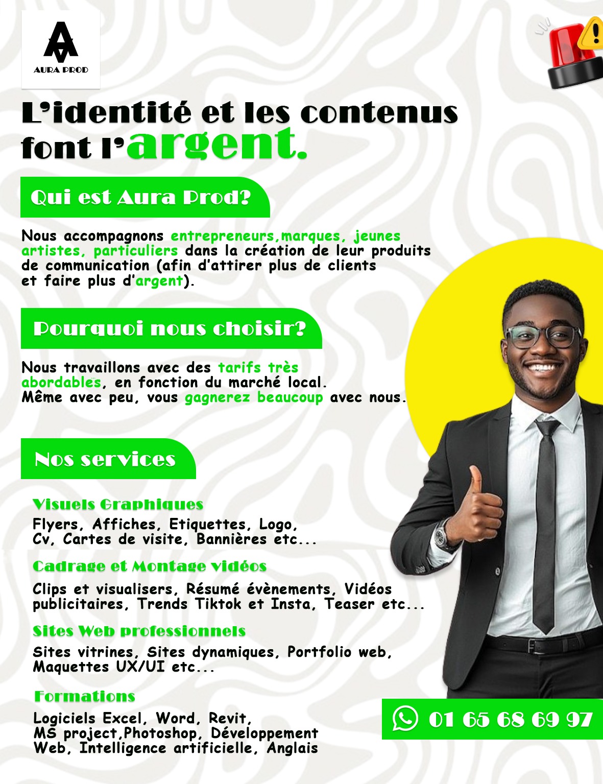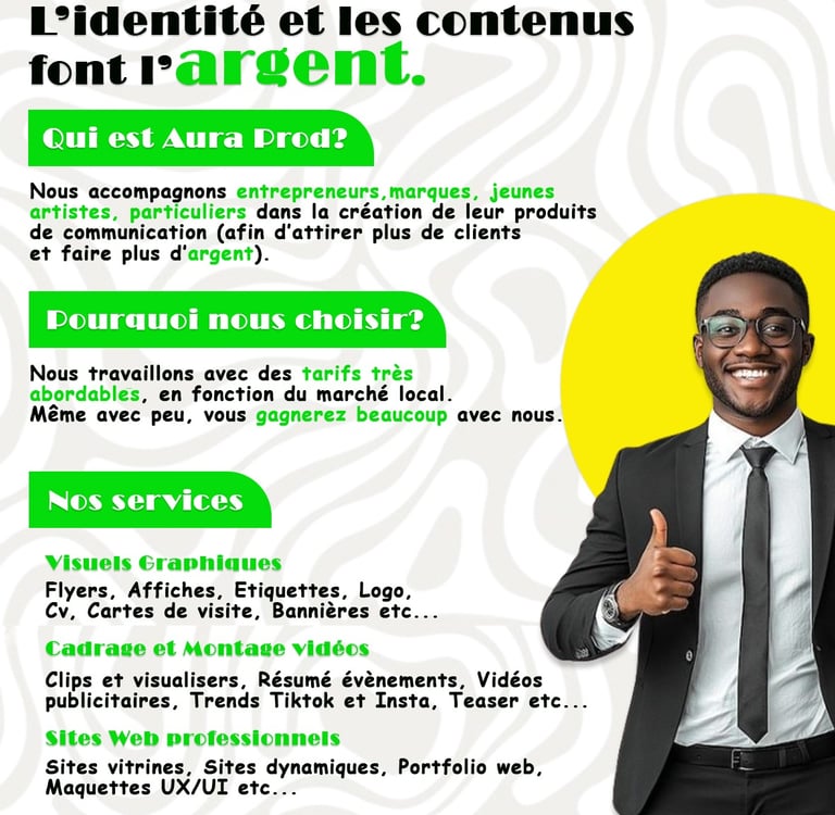 Aura prod est une agence créative basée à cotonou qui accompagne les jeunes entrepreneurs, petites structures (Cafétéria, Prêt à porter, boutique, vendeuses de jus etc..) dans leur conception de produits communicatifs.